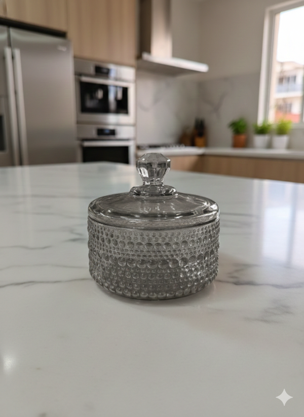 Caramelera de vidrio con detalles en puntitos, súper delicada, medida 10x12cm