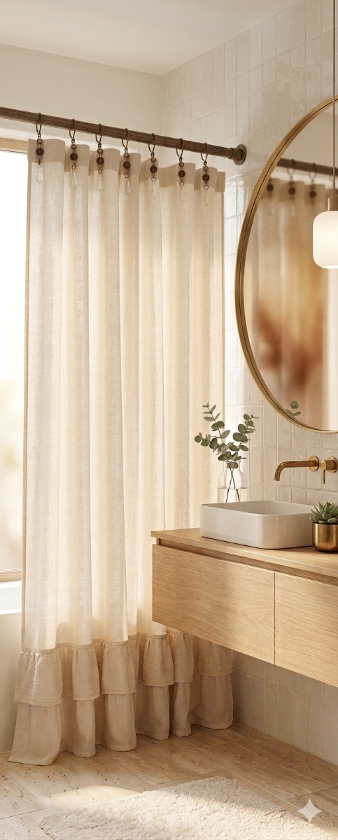 Cortina con volados realizada en gasa de algodón para ganchos de cortinas, ya que tiene ojales.